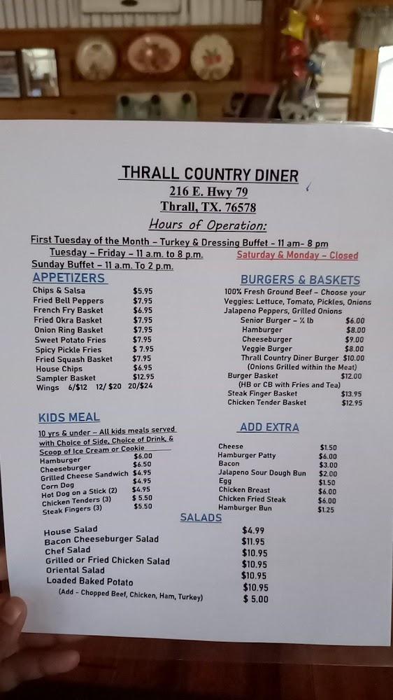 Welcome to Thrall Country Diner, where comfort meets tradition in a cozy setting. Located at 216 US-79 in Thrall, TX, our diner is the perfect spot for breakfast, lunch, or dinner. Enjoy our excellent coffee and locally inspired desserts while savoring simple, wholesome meals made from fresh ingredients. We offer convenient services including takeout, drive-thru, and delivery options, with full accessibility for all guests. Whether you're dining solo or with a group, our relaxed atmosphere and friendly staff await you. Join us for a true taste of local flavor! Call us at +1 512-365-9554 to reserve your table today.